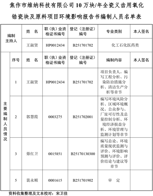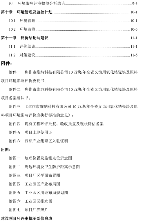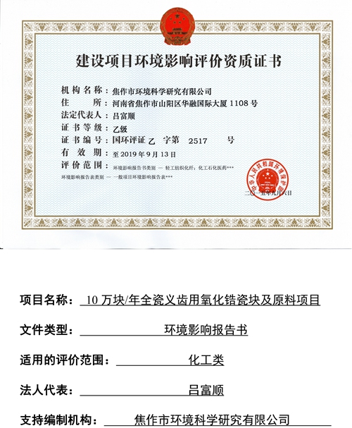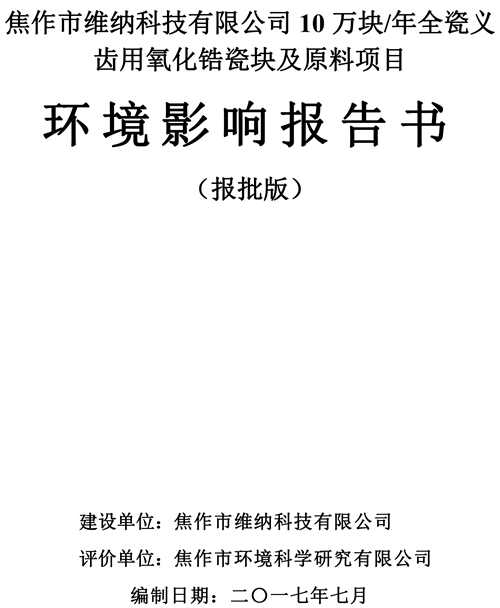 關(guān)于焦作市維納科技有限公司10萬塊/年全瓷義齒用氧化鋯瓷塊及原料項(xiàng)目環(huán)評(píng)報(bào)告書信息公司。